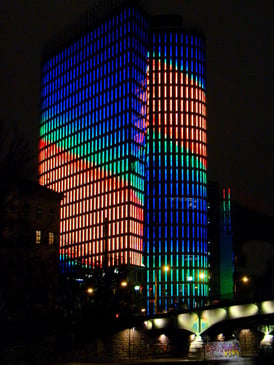 Auch der Uniqa-Versicherungsriese strahlt im wechselnden Lichterglanz weit sichtbar über den Donaukanal