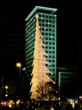 Bis zum 19. Stockwerk in 60 m Höhe leuchten die Lichter und heuer werden zusätzlich 300 Schneeflocken den Baum umspielen.