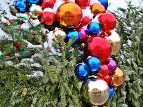 In dieser weihnachtlichen Dekoration am Eingang zum Christkindlmarkt vor dem Wiener Rathaus spiegelt sich in den Kugeln das vis a vis liegende Burgtheater.