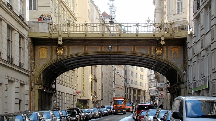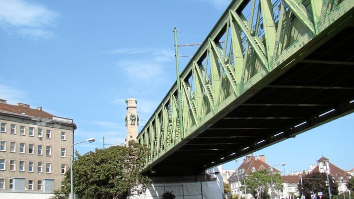 Eines der großartigsten Bauwerke der Stadtbahn ist die sogenannte "Brücke über die Zeile" zur Überführung der Gürtellinie (heute U6) über das Wiental.
