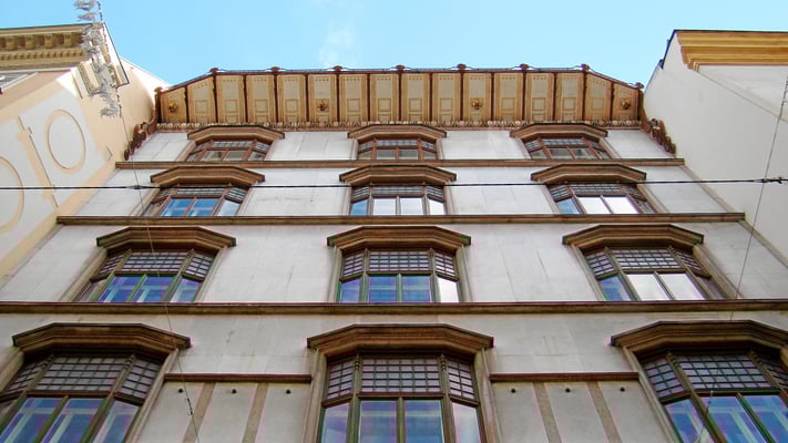 Das "Zacherl-Haus" auf der Brandstätte 6 verdankt seinen Namen dem Bauherrn, dem Insektenpulverfabrikanten Johann Zacherl. Er wählte einen Entwurf von Joze Plecnik aus - ebenfalls ein Otto Wagner-Schüler.
