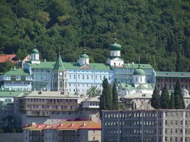 Das Kloster sieht aus wie eine kleine Stadt. Es wurde im 12. Jahrhundert gebaut und heute leben 70 Mönche russischer Abstammung hier. Anfang des 20. Jahrhunderts waren es 2.000. Im Glockenturm hängt die zweitgrößte Glocke der Welt - 13 Tonnen, Durchmesser 2,71 m, Umfang 8,71 m. Im Vordergrund Herberge und Krankenhaus.