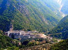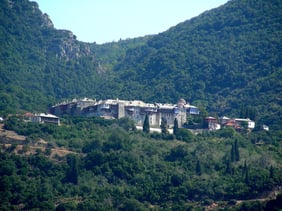Das Kloster liegt am Fuß des Athos und wurde im 14. Jahrhundert gegründet. Heute leben 70 Mönche dort - weitere 70 leben in der "Wüste" (Erimos) ein felsiger Teil mit kleinen Häusern, hier ziehen