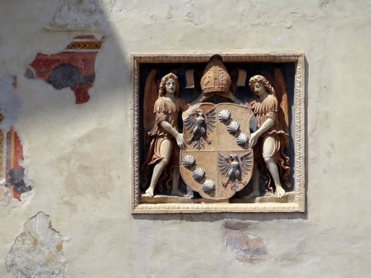 An der Fassade des Schlosses lassen sich mehrere Bauphasen ablesen, wobei die spätgotische Venezianische Loggia besonders reizvoll erscheint.