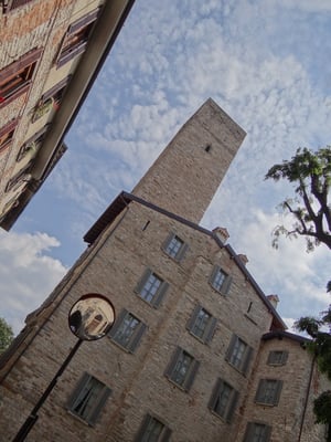 Der "mittelalterliche Turm" ist ziemlich schief geraten und ist ein starker Kontrast zu den Gebäuden ringsum, worunter sich einige schöne Villen befinden, die im Privatbestitz sind.