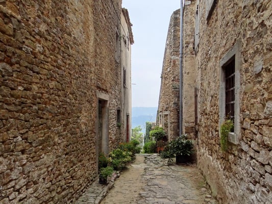 Am nächsten Tag starteten wir einen Rundgang im mittelalterlichen Städtchen Motovun, das hoch über dem Mirna-Tal liegt. Ganz besonders schön ist die Stadtbesichtigung auf dem gut erhaltenen Ringwall aus dem 14. Jahrhundert, der einen Blick über die Dächer und das Tal gibt.